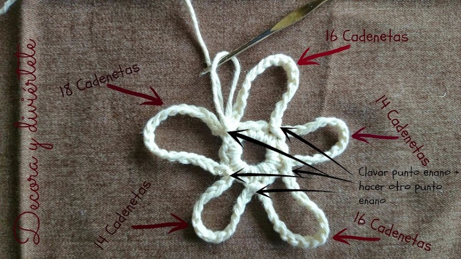 Y ahora hacer 18 puntos de cadeneta que será el primer pétalo....