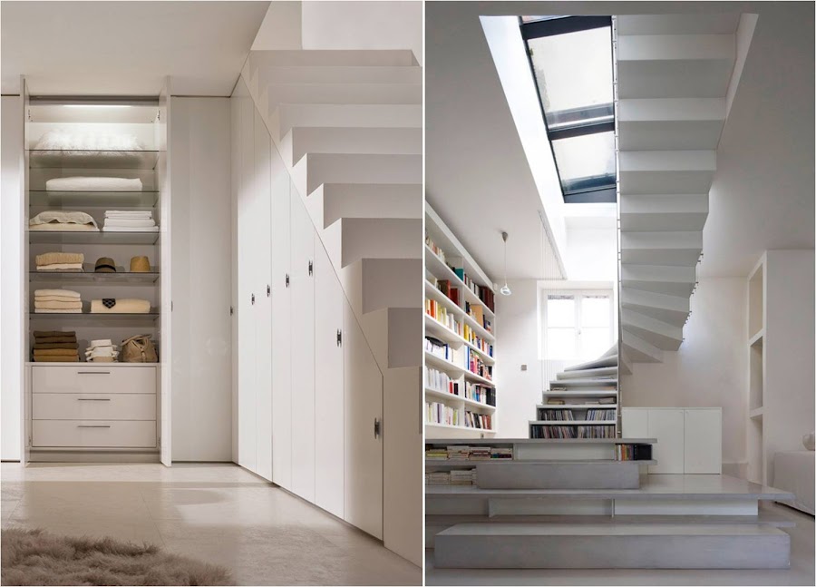Con armarios cerrados, estanterías o cajoneras puedes improvisar un vestidor, una librería, un trastero o una bodega. Y si prefieres cajones puedes realizarlos a medida, de gran capacidad para albergar objetos grandes; bajo la rampa o camuflados entre los peldaños, en las contrahuellas de subida.Cajoneras a medida con ruedas para extraerlas y ver todo el contenido, o combinando puertas y cajones.
