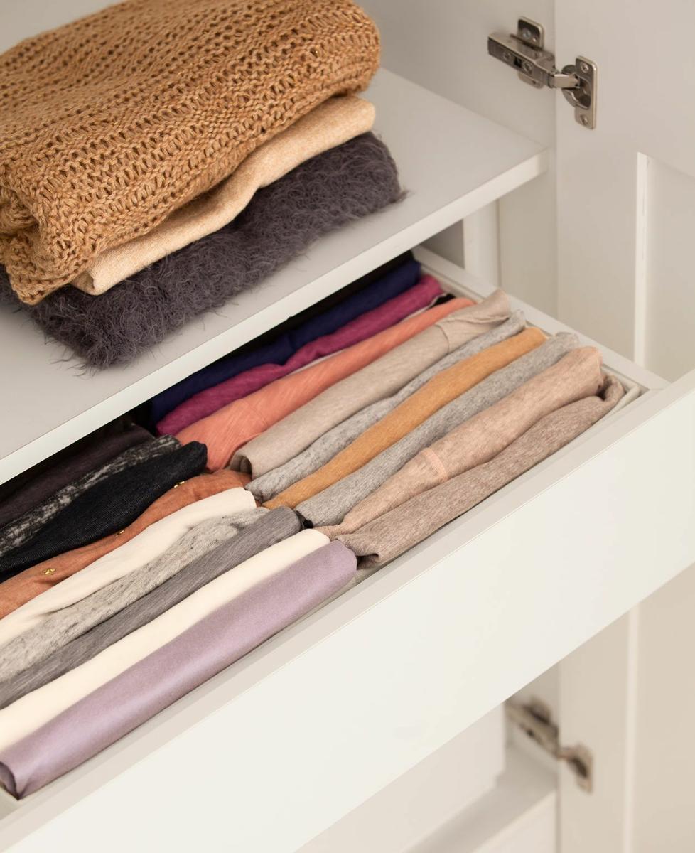 Fuente: pinterest Las camisetas guárdalas con el método vertical de Konmarie. Para que las prendas se aguanten en vertical hay que hacer uno o dos pliegues más de lo habitual. Comprueba que se aguantan por si solas.