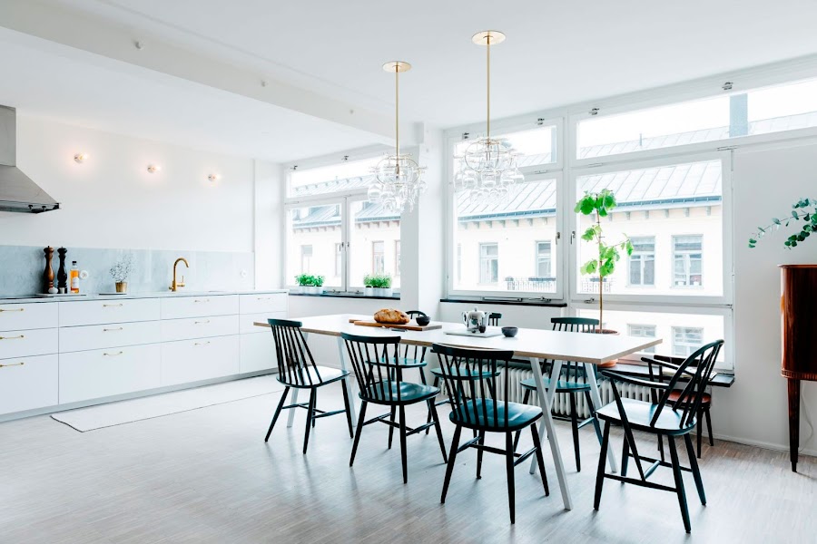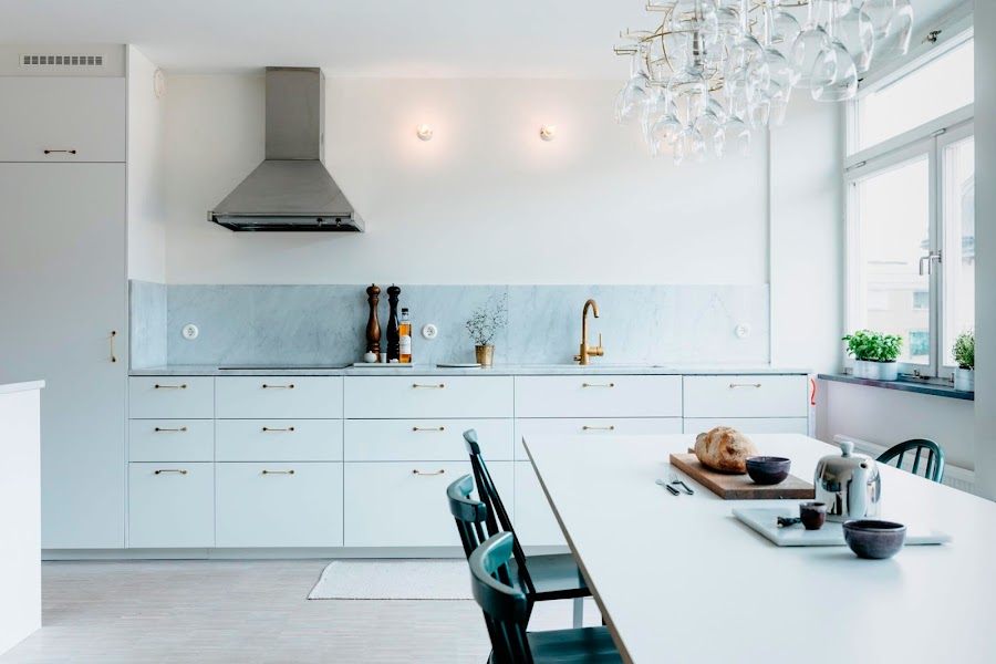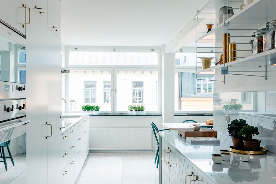 Como os decía, la casa de hoy ha sido estudiada y pensada al milímetro, y es que viéndola, se intuye que sus propietarios tienen un montón de cosas que guardar. Ya sabéis que una de las cosas en que más espacio se aprovecha es en tener los espacios abiertos, y en este caso, la cocina es abierta al salón. Aunque es cierto que en la parte de arriba no se han colocado muebles, se han reforzado muchísimo en la parte inferior. Muebles de gran almacenaje y muy bien integrados con toda la decoración de la casa.