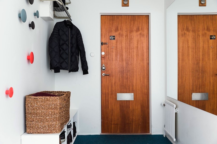 Y para terminar, en la entrada se ha improvisado un pequeño vestidor en el que podemos ver, unos colgadores muuto en la pared para poder dejar las bolsas de mano, fulares etc,, unas estanterías con una barra para colocar toda la ropa que usemos a diario y se ha rematado añadiendo un pequeño zapatero y una cesta encima para dejar todo aquello que no queda bonito a la vista.