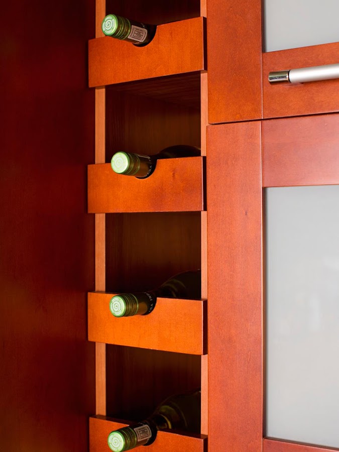 En un armario estrecho al lado de la nevera ha colocado un organizador de botellas.