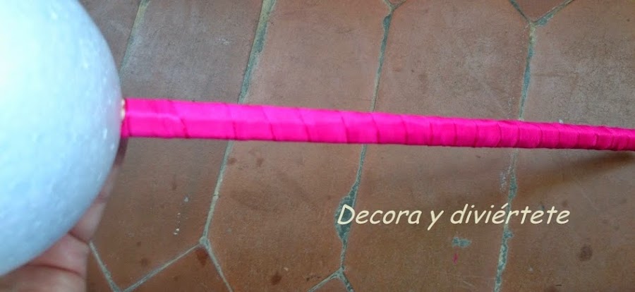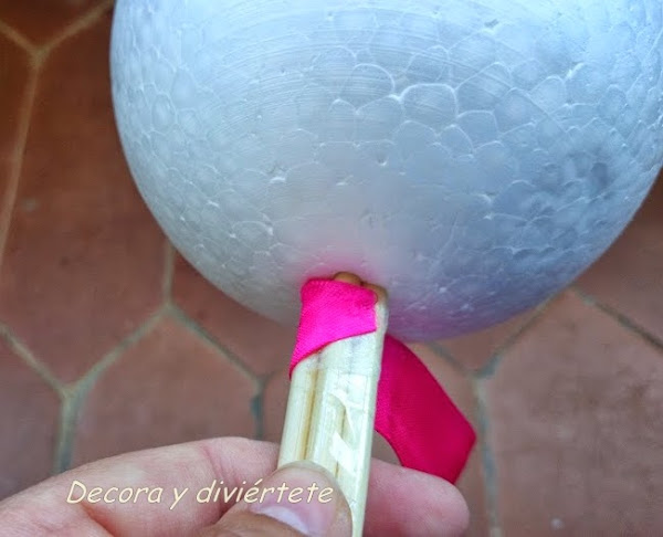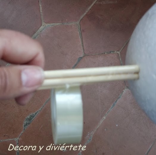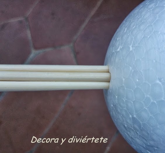 1- Unir el palo con la bola de Unicel o Porexpán ....Yo decidí utilizar los pinchos para que veáis que también quedan bien y creo que la mayoría de nosotros tenemos por casa .