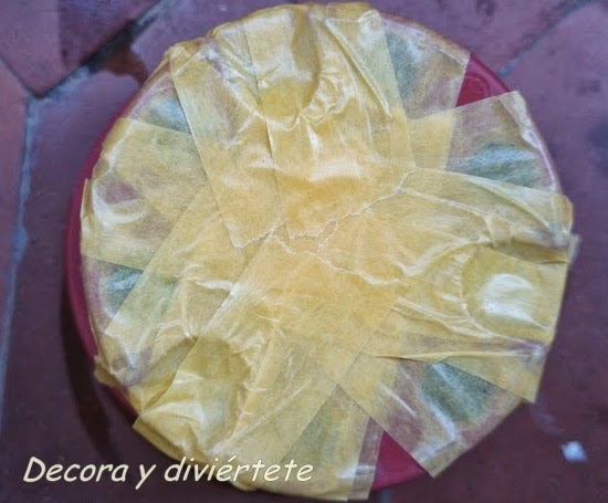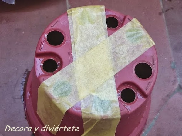 3- El tercer paso es tapar los agujeros de la maceta , para ello utilizar cinta de embalar o cinta adhesiva ancha y que pegue bien , aseguraos que queden muy bien tapados .