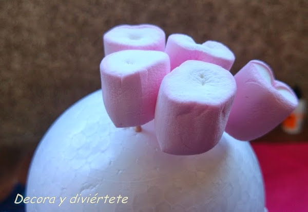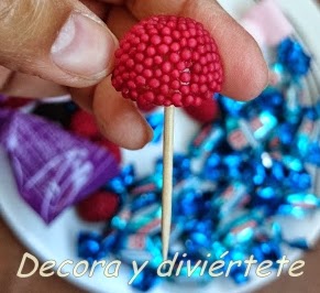 6- Dejadlo secar MUY bien , y una vez seco ya podéis clavar las chuches o gominolas que queráis , fijaos en la foto para ver como se hace , primero se clava el palillo en la chuche o gominola y después en la bola ....