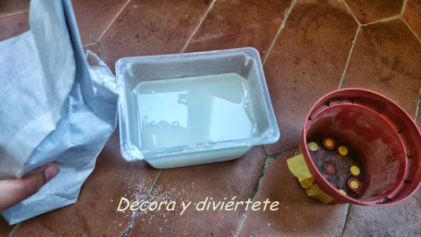 4 - El siguiente paso es preparar la escayola , mezclar bien el agua con los polvos y pasar la mezcla a la maceta , sobretodo ponerle algún recipiente debajo de la maceta antes de vertirla , siempre hay accidentes como que salga la escayola por los agujeros de la maceta por que no hayan quedado bien tapados ...
