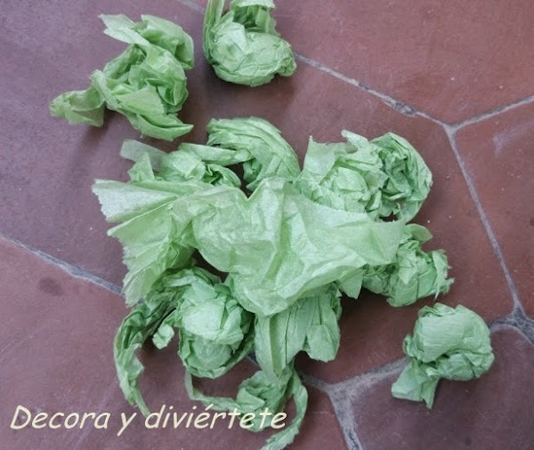 Mientras esperáis a que cuaje la escayola , podéis ir preparando la decoración de la maceta . Yo utilicé papel de seda de color verde , para ponerlo encima de la escayola antes de que se seque del todo , de esta forma no se caerá la decoración ...