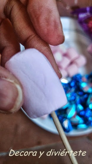 Para este árbol escogí tres tipos de dulces , las nubes , unas moras y caramelos envueltos de esta manera veréis como se clavan cada una de ellas , las primeras fueros las nubes que son muy blanditas y tenéis que ir con cuidado de no hacer fuerza ya que las aplastaríais .