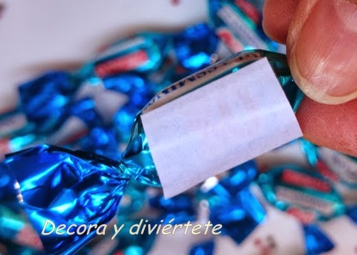 Y para los caramelos envueltos , necesitáis otra vez la cinta adhesiva de doble cara , primero ponéis una de las partes que se pegan en el caramelo , vigilando que no sea en el sitio por donde se abre y después quitáis la protección de la cinta adhesiva y pegáis el caramelo en la bola de porexpán
