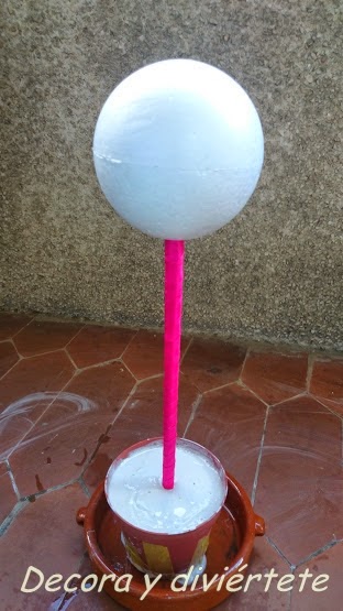 5 - Paso .... Una vez comprobado que la escayola ya se está secando , para saberlo utiliza este truco, pincha con un palo y cuando veas que se aguanta solo ya esta lista para utilizar ,pero ojoo sin estar duro , clava el palo con la bola de porexpán . Ir limpiando la escayola de la superficie donde lo hagáis o poner un papel para protegerla .