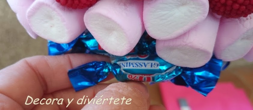 Yo os recomiendo que cuando hagáis un árbol mezclando gominolas y caramelos envueltos , en la parte de los caramelos envueltos tendréis que poner dos capas de caramelos para que queden a la misma altura ( siguiendo la forma de bola ) de las gominolas , ya que los caramelos no tienen tanto volumen como según que gominolas .