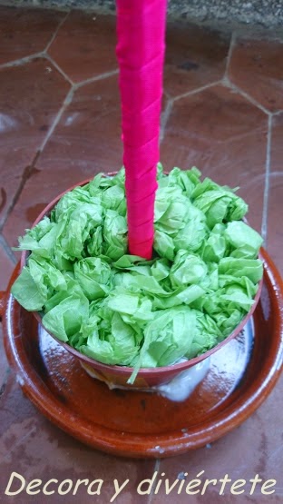 Y acto seguido y con mucho cuidado de no tocar el palo clavado, vais poniendo las bolas de papel de seda o lo que hayáis querido poner como por ejemplo tierra de maceta ( no queda tan fija y puede caerse , pero puede ser una opción ) y este es el resultado ....