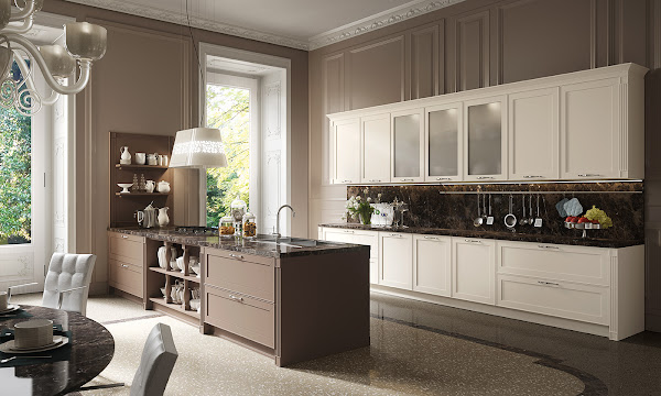 El fino acabado en laca tortora y tierra mate y las encimeras de mármol incluso en la pared frontal, se unen con la funcionalidad más avanzada en éste estupendo modelo Montecarlo de la firma italiana Gicinque.