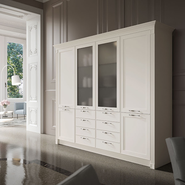 Las molduras de su contorno, la cornisa superior o las pilastras entre algunos de los muebles, adornan todo el conjunto suavemente, haciendo que sobre cualquier otro detalle decorativo a su alrededor.