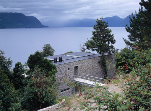 El edificio se encierra con un muro de piedra tradicional en su acceso, abriéndose al lago mediante una fachada completa de vidrio.