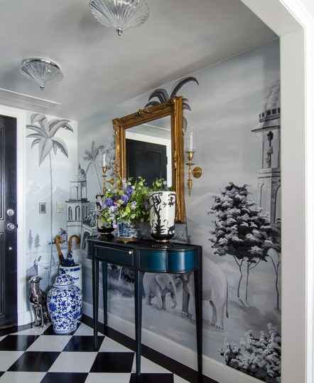 El hall de entrada es un espectáculo en sí mismo: el suelo en damero, el mural de la pared, la consola antigua, las cerámicas, todo junto, pero no revuelto! En esta vivienda, el más, es más!