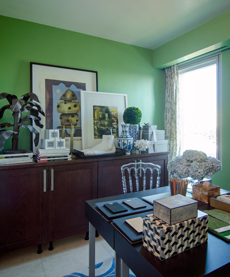 Y para acabar, la zona de trabajo, en la que el color de las paredes cambia y adopta un verde manzana, con un espacio para sus colaboradores y como podéis ver con todo tipo de detalles: flores, cajas, jarrones, cuadros, objetos de papelería, etc... un detalle para copiar, son las puertas de división del espacio, que se han usado como base para mood boards! le da un aspecto muy divertido y mucho más desenfadado al espacio.
