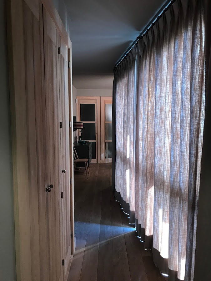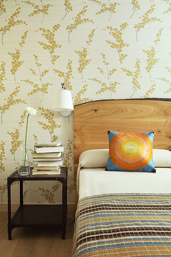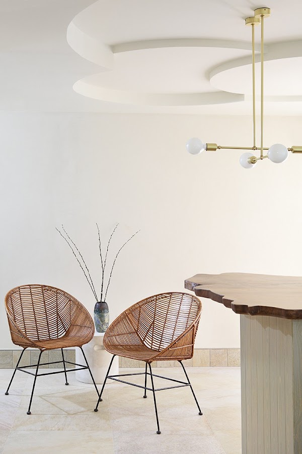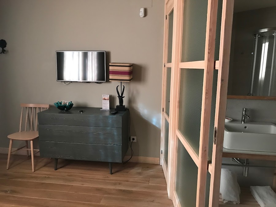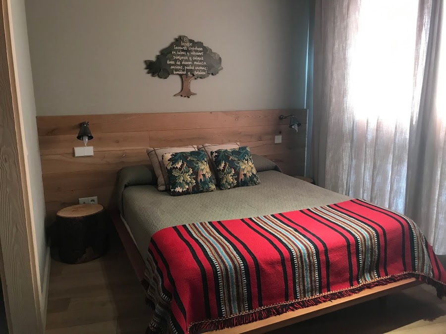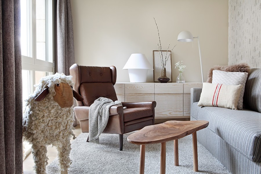 Nosotros nos alojamos en "El bosque" y por tanto el apartamento entero así como los tratamientos que se ofrecen en esta suite, se encuentran inspirados en esta temática. El salón comedor cocina es sólo una pieza, en la que encontramos decoración en cerámica alemana de los sesenta y otra marroquí. Tanto el sillón, el puf, como la alfombra son de fibras vegetales. Mesa de centro en cerámica y hierro, también diseño de Erico. El comedor con sillas DSW de los Eames en negro.