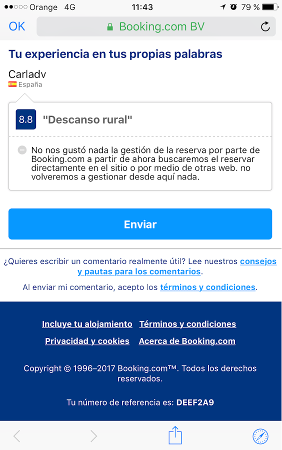 Y lo último ha sido dejar nuestro comentario, en el que destacábamos positivamente al establecimiento y en aspectos negativos nuestro descontento con "bkng" en el limbo. Tampoco nos explayábamos mucho, solo poníamos el pantallazo que os dejo a continuación: