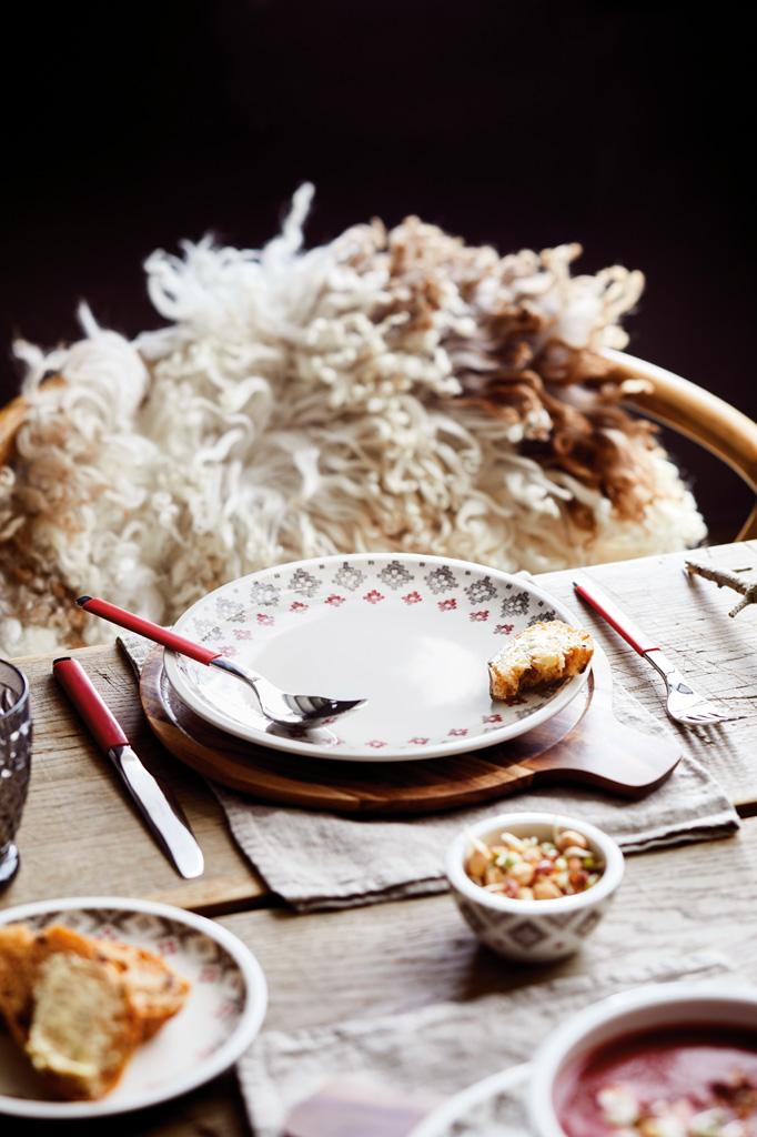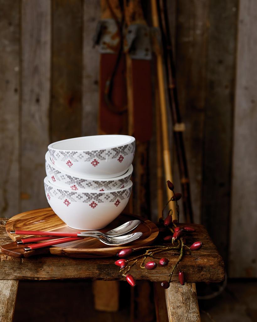 Como podéis ver, una mesa vestida con estos platos nos traslada a un cálido romanticismo ideal desde principios del otoño hasta el final del invierno. Y lo hace con una fina decoración inspirada en los patrones de tejido de punto de Noruega, traduciendo el típico copo de nieve y el pequeño diamante en un gris cálido con un diseño rojo sobre cerámica blanca, motivos rústicos y gráficos al mismo tiempo que hacen hincapié en el carácter artesanal de la forma del plato.