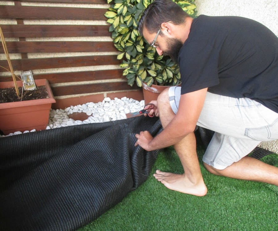 Ya en casa despejamos la terraza, limpiamos bien el suelo y nos pusimos manos a la obra. Comenzamos a ajustar el césped desde una de las esquinas de la terraza y fuimos extendiendo desde allí hacia el resto. Es importante que si vais a colocar césped lo hagáis entre dos personas porque va a ser más fácil para presentarlo, estirarlo y que no queden burbujas ni se tuerzan las piezas que tengamos. Luego fuimos cortando con un cuter los sobrantes que íbamos teniendo en cada borde, y quizás esta es la operación mas difícil porque hay que cortar y cuadrar bien para que el resultado sea el mejor, aquí es donde vamos a poder diferenciar un césped mal colocado de forma rápida, de otro puesto con paciencia y cuidando cada detalle. Yo os aconsejo que lo toméis con paciencia, que no se tarda mucho tampoco, y cortéis tranquilamente para cuadrarlo a la perfección. Y como os he dicho antes, como no tenia que pegar ni nada pues fue terminar de cortar y poder empezar a disfrutar del césped. (el guapo de la siguiente foto soy yo jajaja).