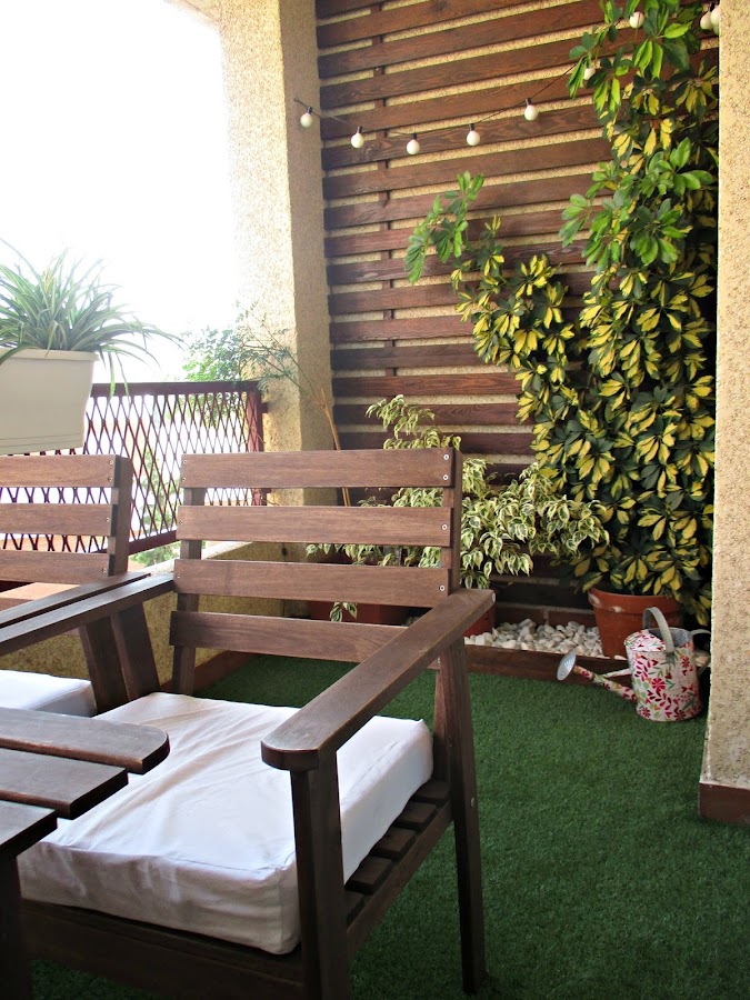 Y ahora vais a poder ver las imágenes de como ha quedado. Pienso que en las fotos se ve bien el cambio pero no del todo al mismo tiempo, porque este cambio es doble, es visual y sensitivo. Primero visual porque de pasar de un suelo viejo y estropeado, de color marrón, a uno nuevo y de un color distinto ya es algo importante, y segundo porque lo que cambian también son las sensaciones. Ahora la terraza parece mas "natural", tiene un rollo jardín muy bonito. Además transmite mucha tranquilidad y frescor, cosa muy importante porque con esto llama a pasar mas tiempo en ella.