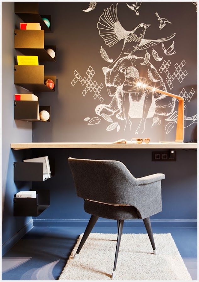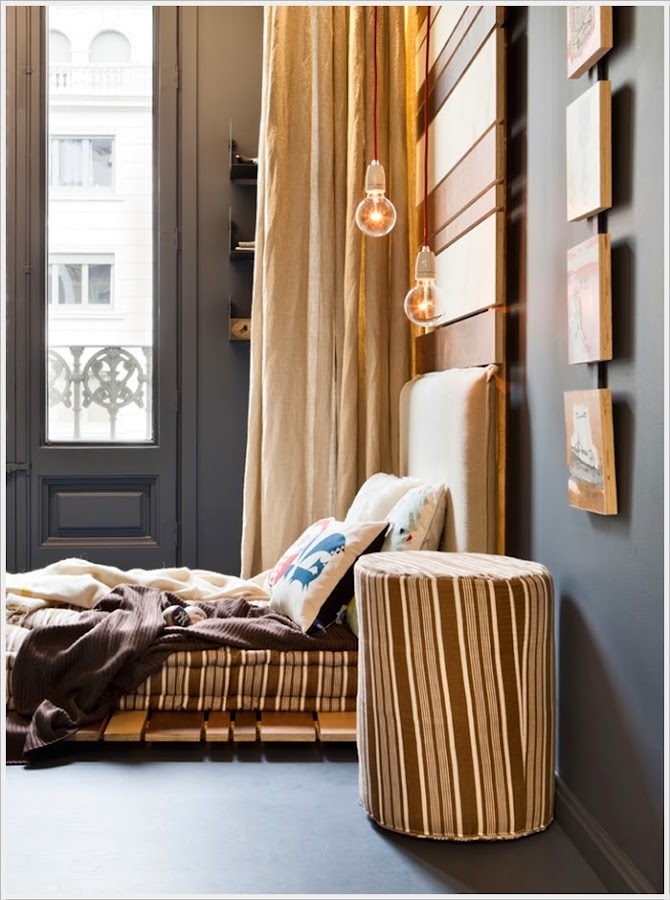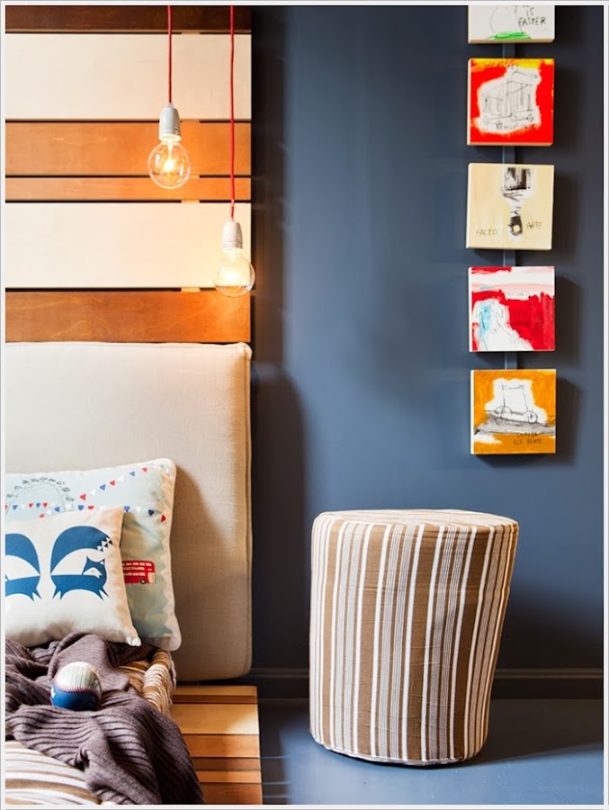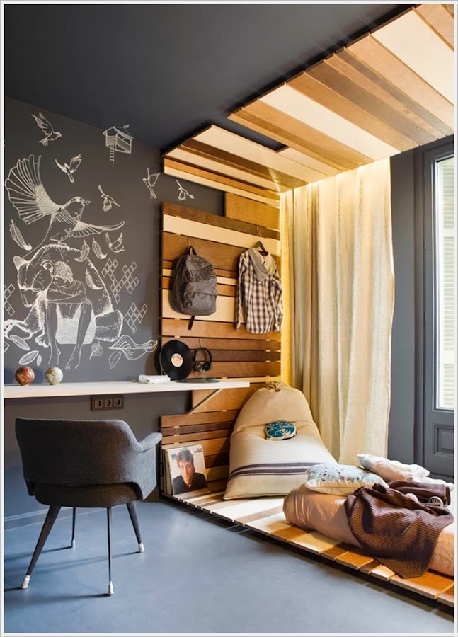 Si tu niño ha crecido y estás pensando en darle una vuelta al dormitorio, aquí va una idea que me ha cautivado.:) Un dormitorio decorado pensando en la adolescencia, con paredes de pizarra, lámparas sencillas y una estructura de cama de lo más original. Me han encantado los tonos tierras en textiles y madera combinados con los grises de las paredes y suelo. Con pocos muebles pero con personalidad, una habitación que invita a disfrutar de ella. Qué queréis que os diga, lo mio con este espacio ha sido puro flechazo....y tengo chicas, ¡en esta caso una pena!