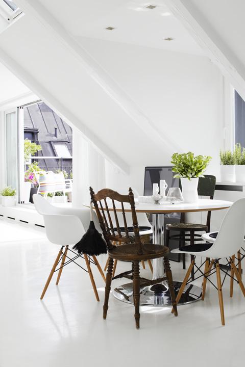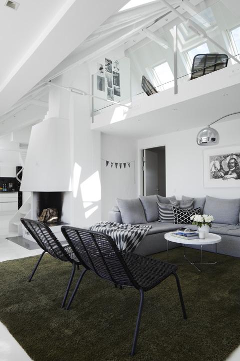 En la sala de estar es la zona que más nos ha gustado, por la sensación que puedes tener al ver la alfombra de un tono verde similar al del césped de un jardÃn. Junto a los tonos grises del sofá y las sillas en negro crea un ambiente harmonioso e informal.