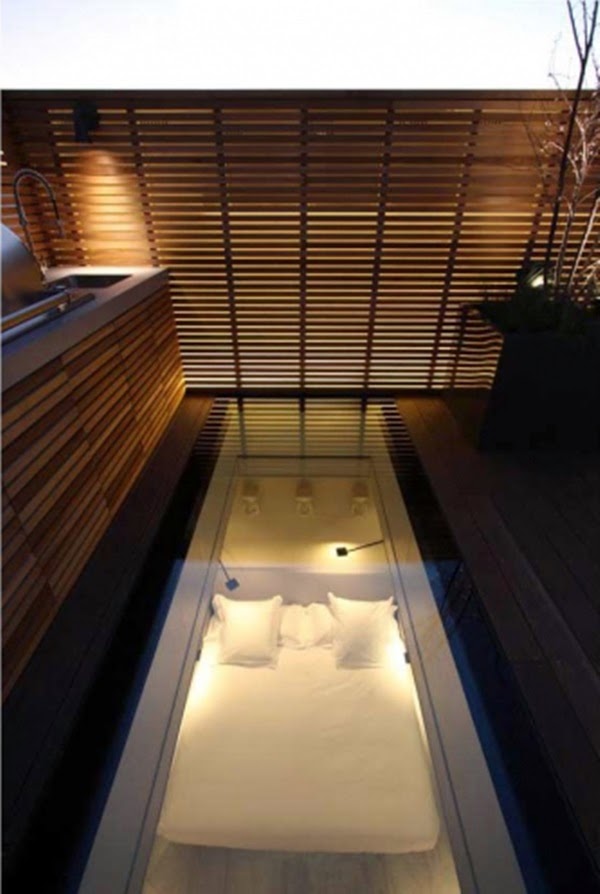 La terraza con unas increíbles vistas panorámicas, cubierta de paneles de cedro natural, previenen el ático del frió invierno y aportan la calidez necesaria. En el suelo se encuentran los paneles de vidrio, intencionados para meter la luz natural de lleno en el hogar y aportar un gran toque decorativo.