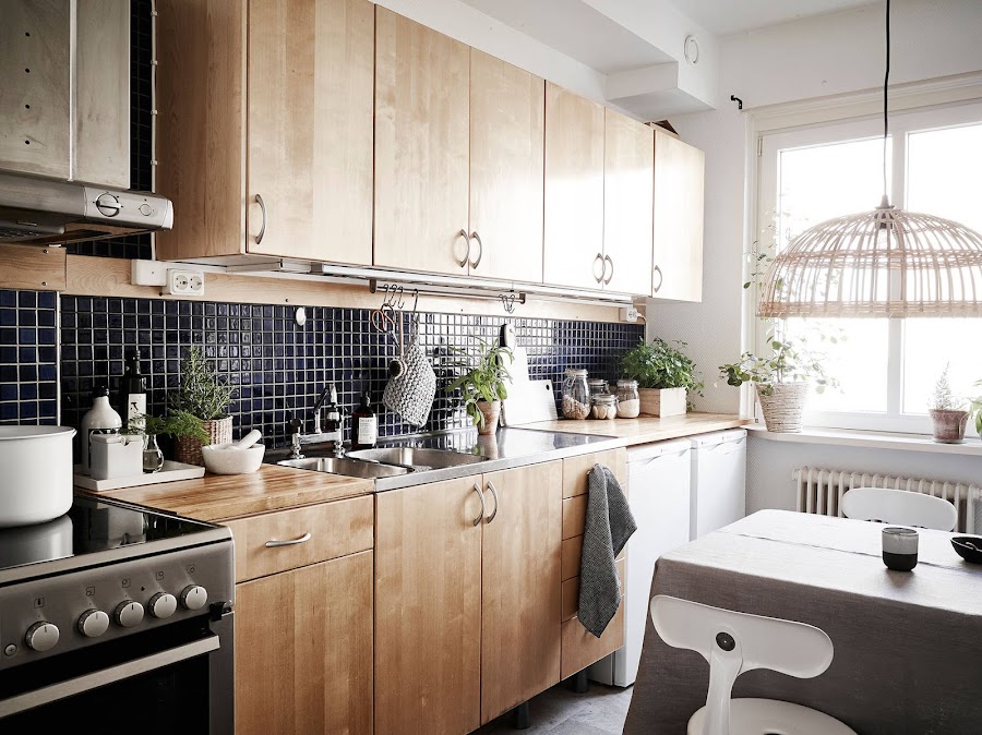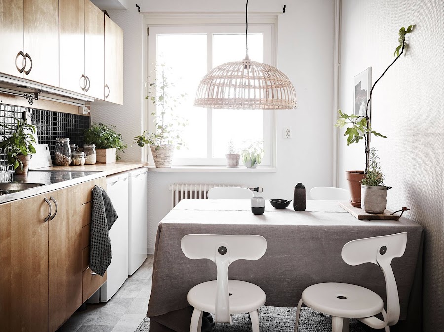 En la cocina volvemos a reencontrarnos con los mismo recursos decorativos para crear una bonita y cálida atmósfera otoñal. Un mantel de lino, lámparas de caña, macetas de barro cocido, cestas de rattán y este toque maravilloso que aportan las plantas en cualquier estación del año.