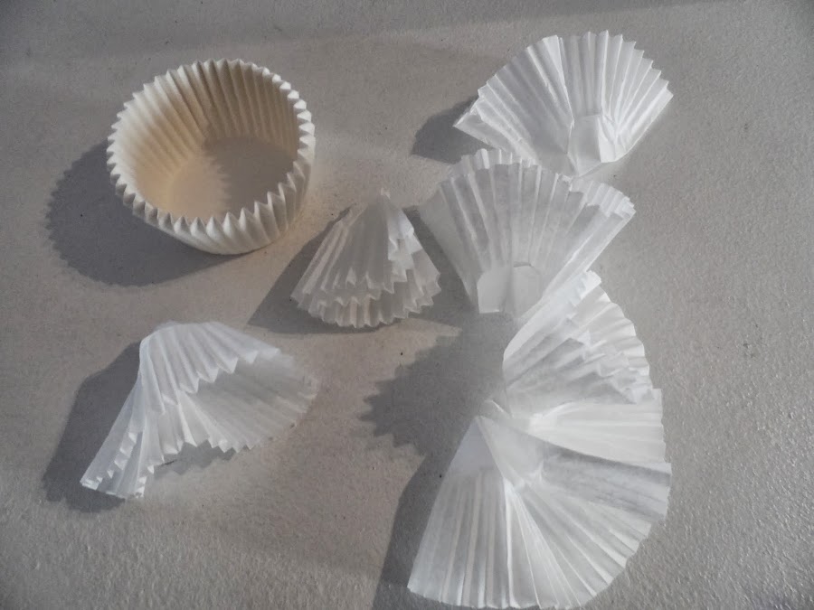 Lo primero que tenemos que hacer es montar la lámpara de papel según las instrucciones del fabricante, no es nada complicado, solo hay que desplegar la lámpara e introducir las varillas metálicas. Una vez montada, para facilitar el proceso e ir mas rápidos, con los moldes de las magdalenas, los separaremos y los doblaremos en forma de flor de papel (como en la imagen)