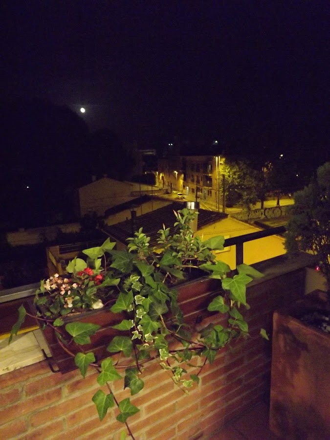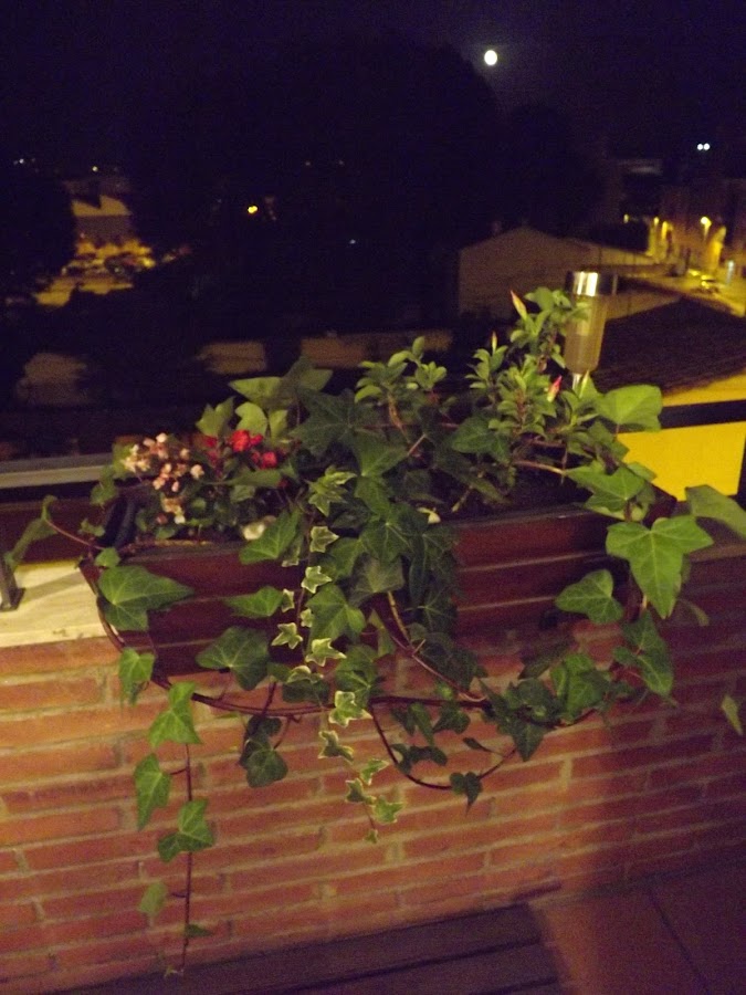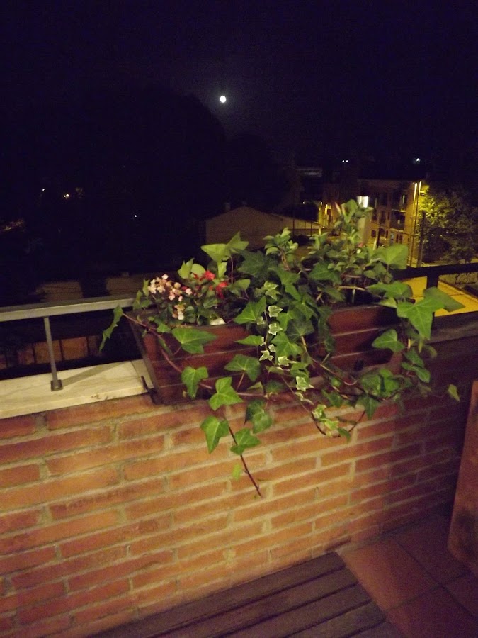 Y sobre mi jardinera repleta de hiedra colgante, begonias y diplademias asoma nuevamente esa luna...