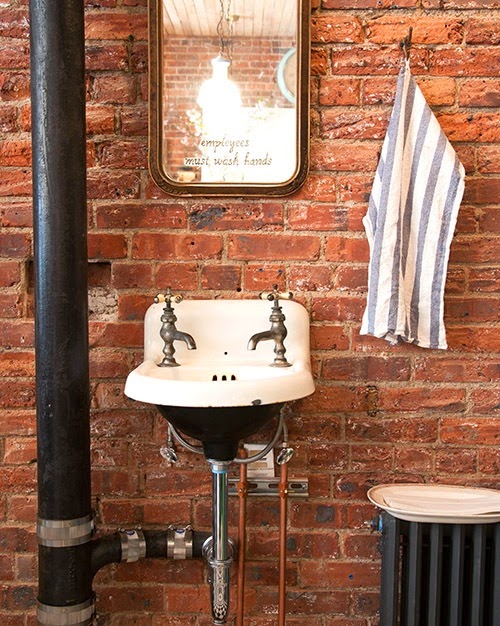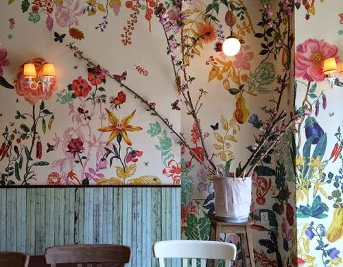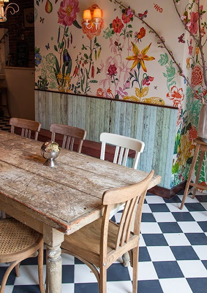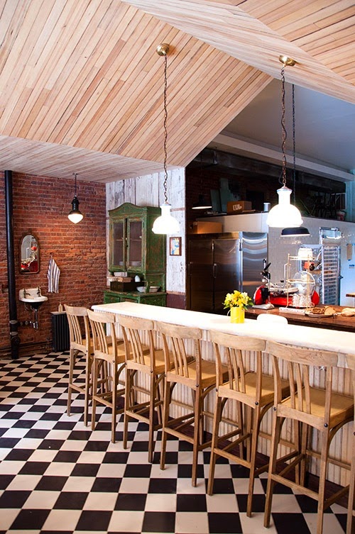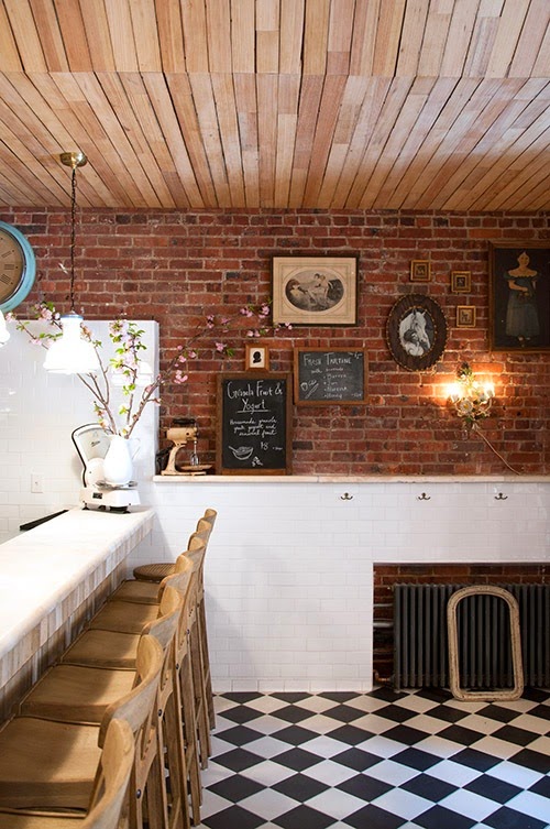 Una vez más el ladrillo visto acompaña al papel pintado que en este caso es floral y alegre. El suelo ajedrezado le da el carácter de los locales neoyorkinos de principios del siglo pasado. Los detalles en sus alacenas y el cuidado mobiliario crean un espacio con un ambiente singular que sin duda te invita a entrar.