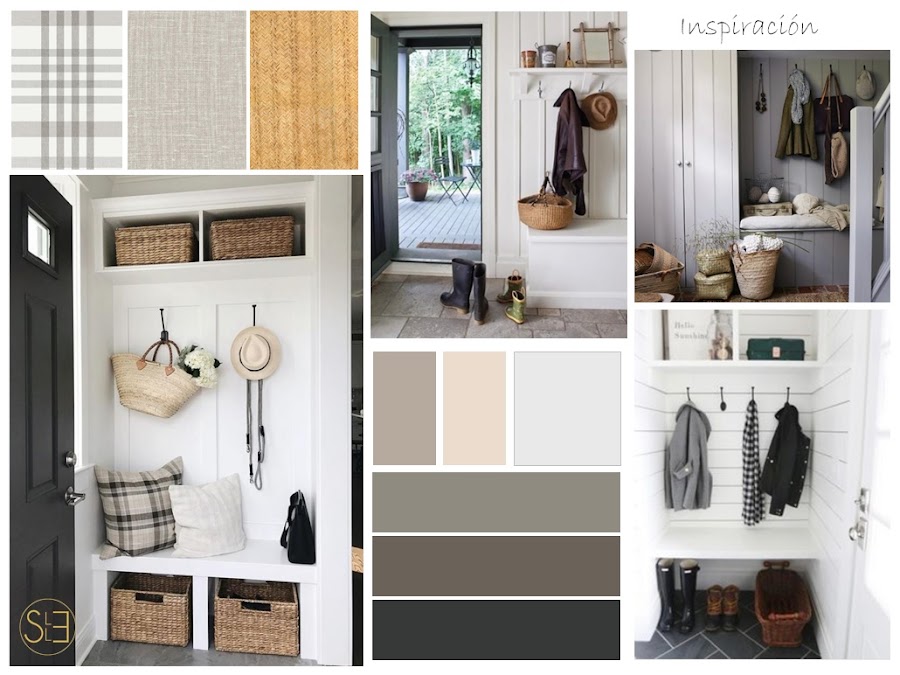 Las imágenes de inspiración son de espacios mucho más grandes al nuestro. Principalmente en casas de campo, con una entrada secundaria donde poder dejar los zapatos, abrigos y incluso la herramientas del jardín. Como podéis ver nosotros no tenemos un espacio así y debemos adaptarnos a nuestro espacio y a nuestras necesidades.