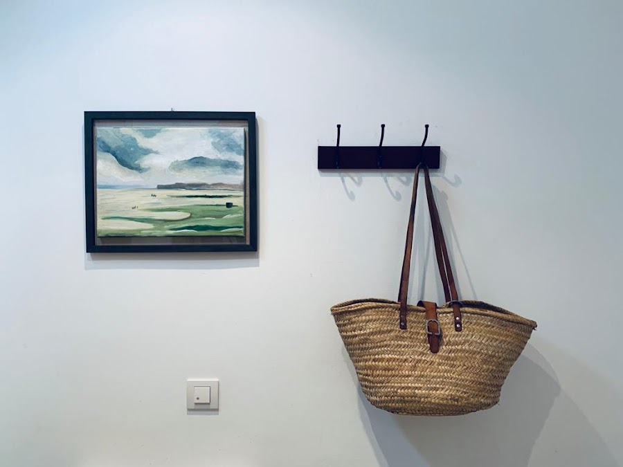 Para hacerlo un poquito más acogedor hemos puesto una cesta con ramas de olivo y un pequeño oleo con el marco de madera igual que el colgador, una decoración muy sencilla, pero que hace este espacio mucho más acogedor.