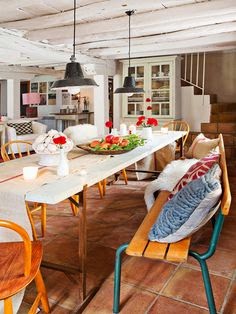 Hola! hace poco publiqué aquí sobre lo bonitas que son las mesas de madera estilo rústico para el comedor e ideas para decorar este espacio. Desde que empecé a buscar en internet sobre este tema, vi varias fotos donde colocan un banco en uno de los laterales de la mesa, lo cual me pareció una idea genial! creo que le da un toque diferente al comedor, y si le añadimos cojines o alguna mantita tendremos un espacio súper acogedor, y si, además combinamos con sillas o taburetes de tipo industrial como las Tolix, o la tipo Eames nuestro comedor será lo más! También quedan preciosas las sillas transparentes estilos Louis Ghost, o con sillas de madera pintadas... en fin! les dejo con estas imágenes, espero que les inspiren tanto como a mi :)