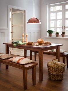 También podemos poner dos bancos y prescindir de sillas, lo cual queda muy bien también. Si hacemos esto, es mejor que los bancos sean iguales y que combinen con la mesa, como vemos en las siguientes imágenes:
