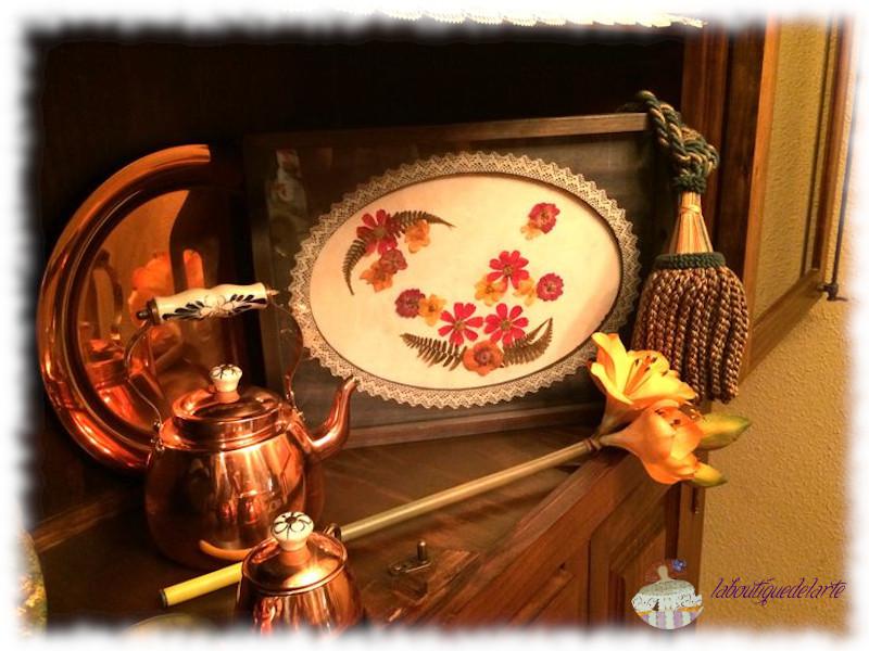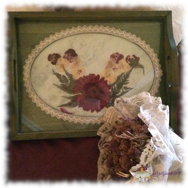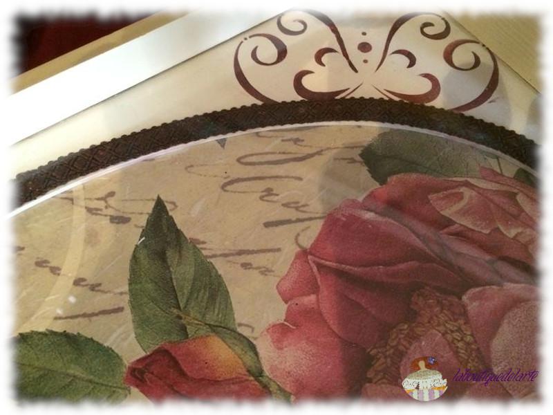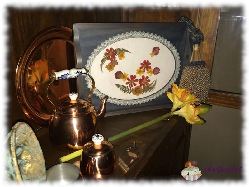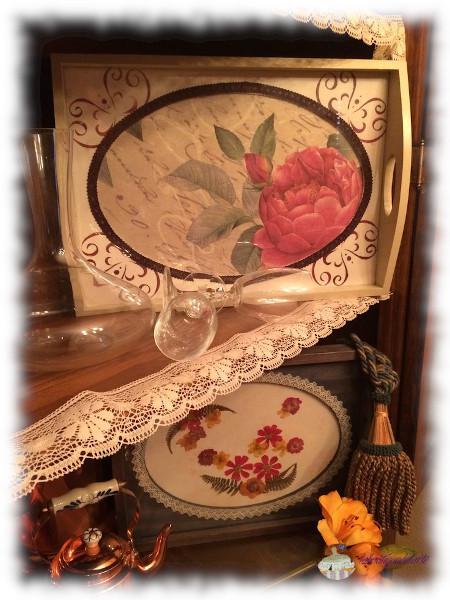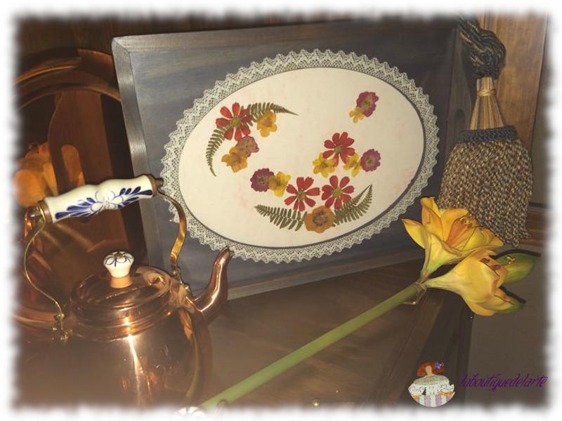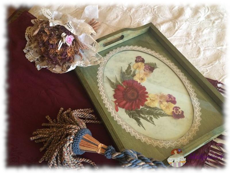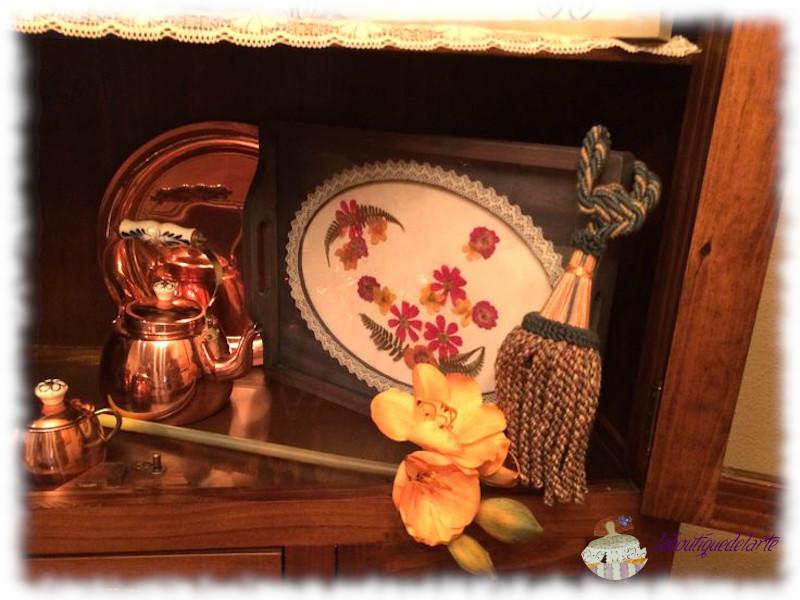 En dos de ellas ha empleado la técnica de la #Pátina, mientras que en la otra ha usado #PinturaAcrílica. Las bandejas van decoradas con #FloresSecas y algo de #Pasamanería, y también ha empleado en alguna, #PapelDeArroz. Todo ello cubierto con un cristal para poder darles uso, como comentábamos anteriormente.