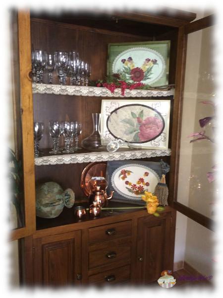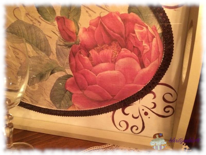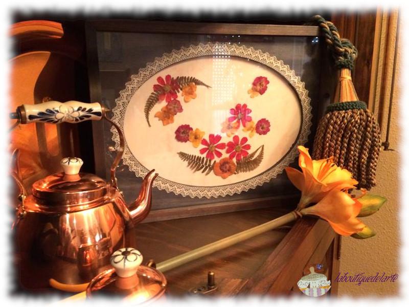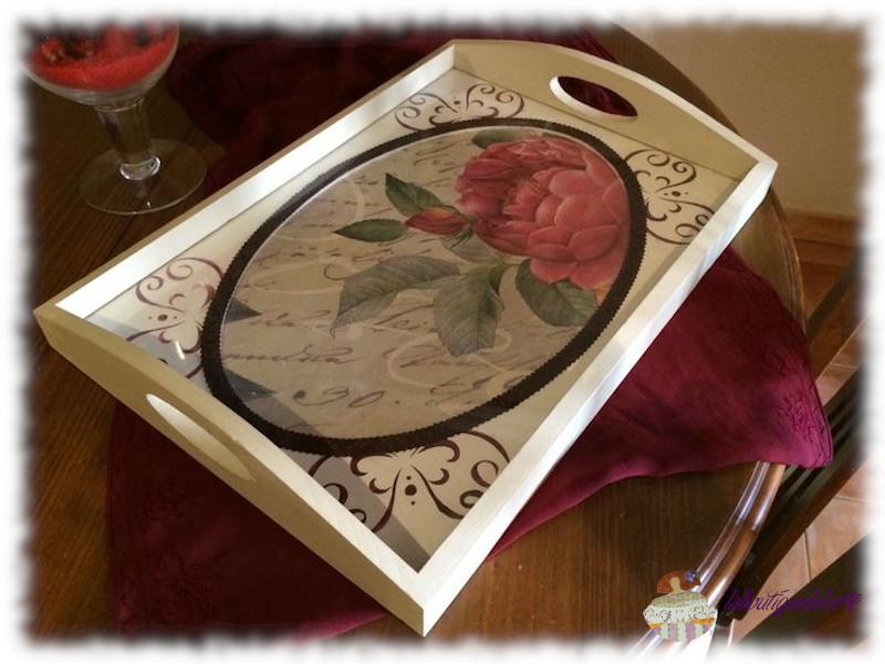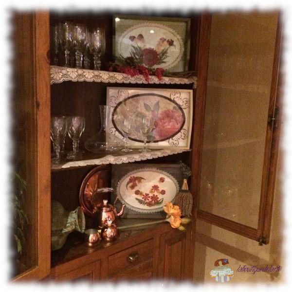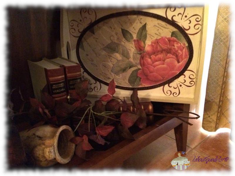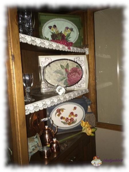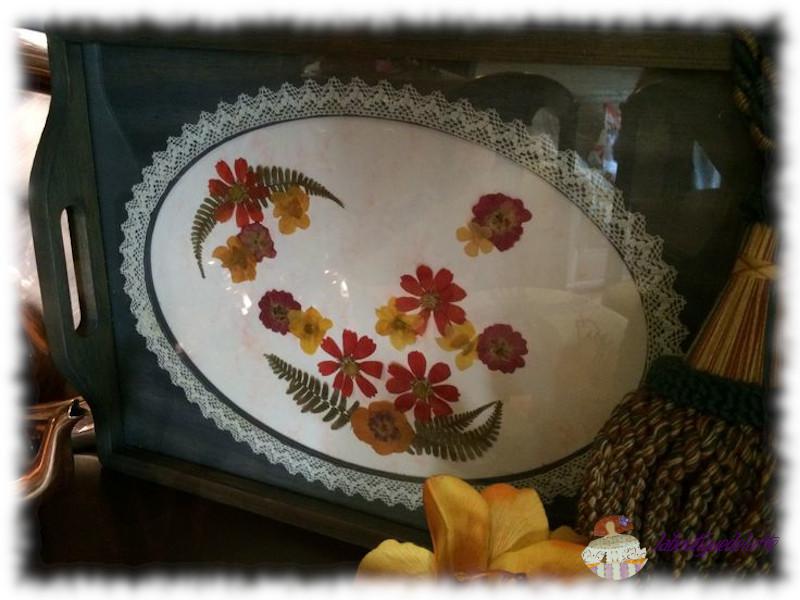 En dos de ellas ha empleado la técnica de la #Pátina, mientras que en la otra ha usado #PinturaAcrílica. Las bandejas van decoradas con #FloresSecas y algo de #Pasamanería, y también ha empleado en alguna, #PapelDeArroz. Todo ello cubierto con un cristal para poder darles uso, como comentábamos anteriormente.