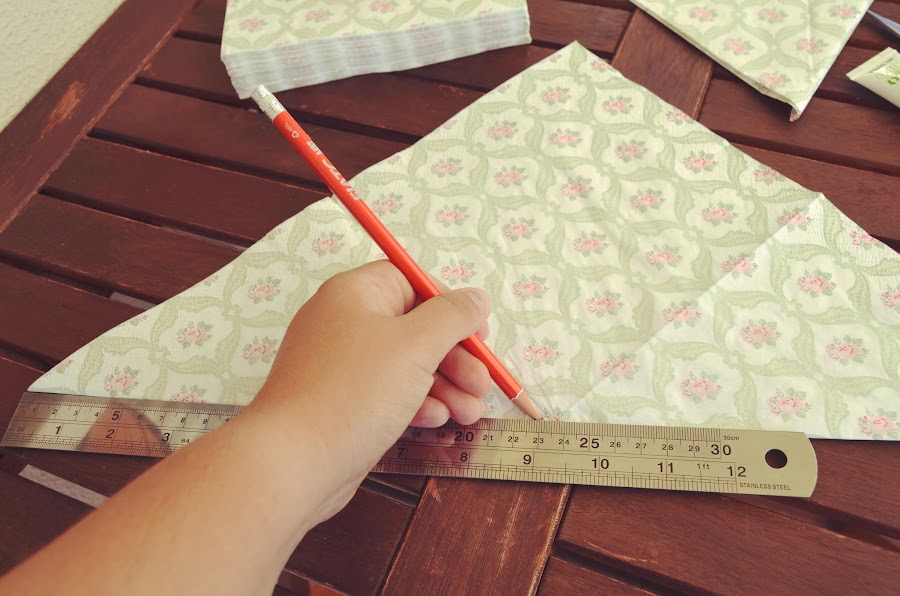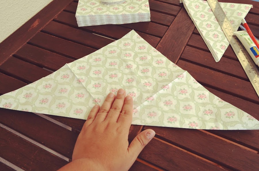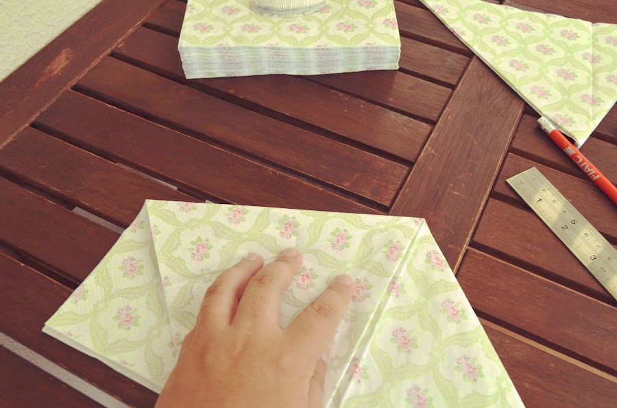 3. Una vez con esta forma marcamos una medida aproximada de 22-23 cm a ambos lados del triángulo. Para una misma servilleta nos salen dos banderines.