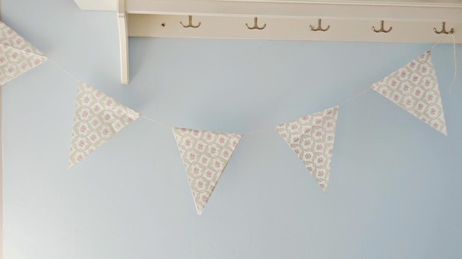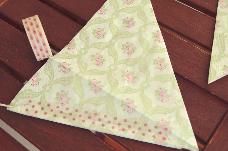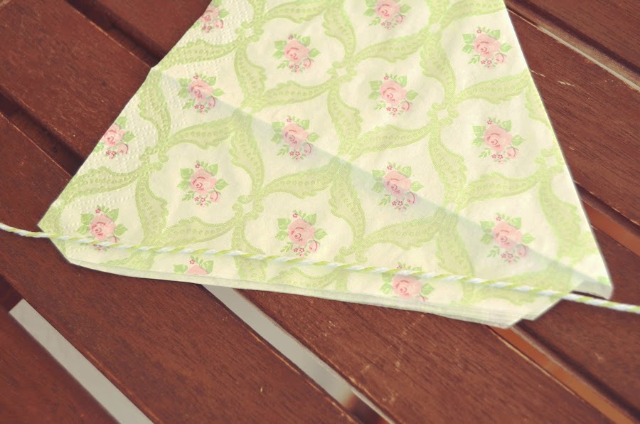 7. Una vez terminado el banderín, repetimos la misma operación dejando un espacio de cuerda de unos 10 o 15 cm entre cada banderín. Puedes hacer tantos banderines como quieras, ya depende de lo largo que lo necesites. Si ves que la servilleta está muy arrugada puedes pasarle un poco la plancha al mínimo y sin vapor, con un paño por encima para quitarle las dobleces. Yo he hecho 5 banderines y este es el resultado final.