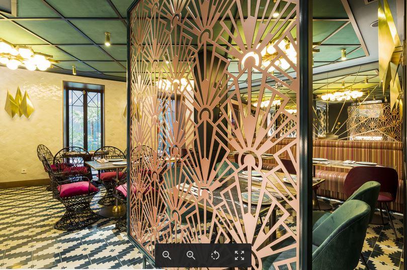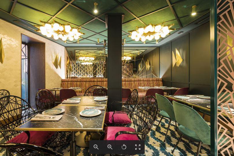 En la planta baja se cambia de gama cromática pero con el mismo tipo de materiales. De nuevo, destaca la aplicación de las celosías de espejo y latón en paredes. Predominan el azul y el granate, tanto en revestimientos como en tapicerías. Destacan los apliques romboides fabricados en latón y las lámparas de suspensión, diseñados a medida para el restaurante. Un bonito patio abierto aporta luz natural con la vegetación y maceteros de barro.