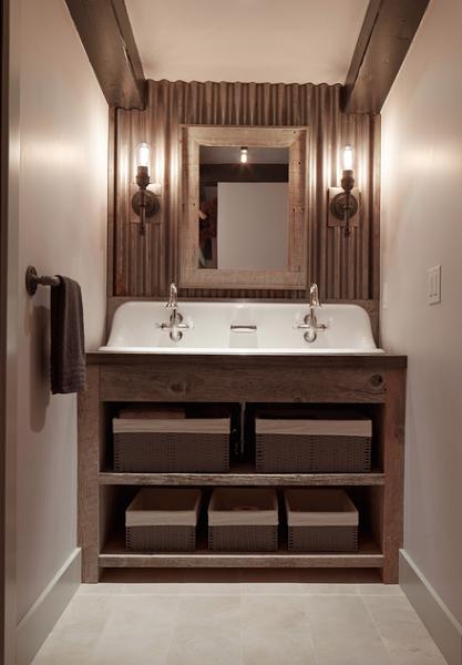 Un baño (3) con un estilo muy farmer (granjero). Madera natural, pila de lavabo con antepecho tipo abrevadero y una pared revestida ¡de chapa ondulada!. Muy conseguido, la verdad, y un resultado muy atractivo.
