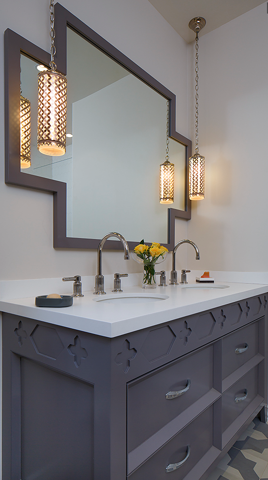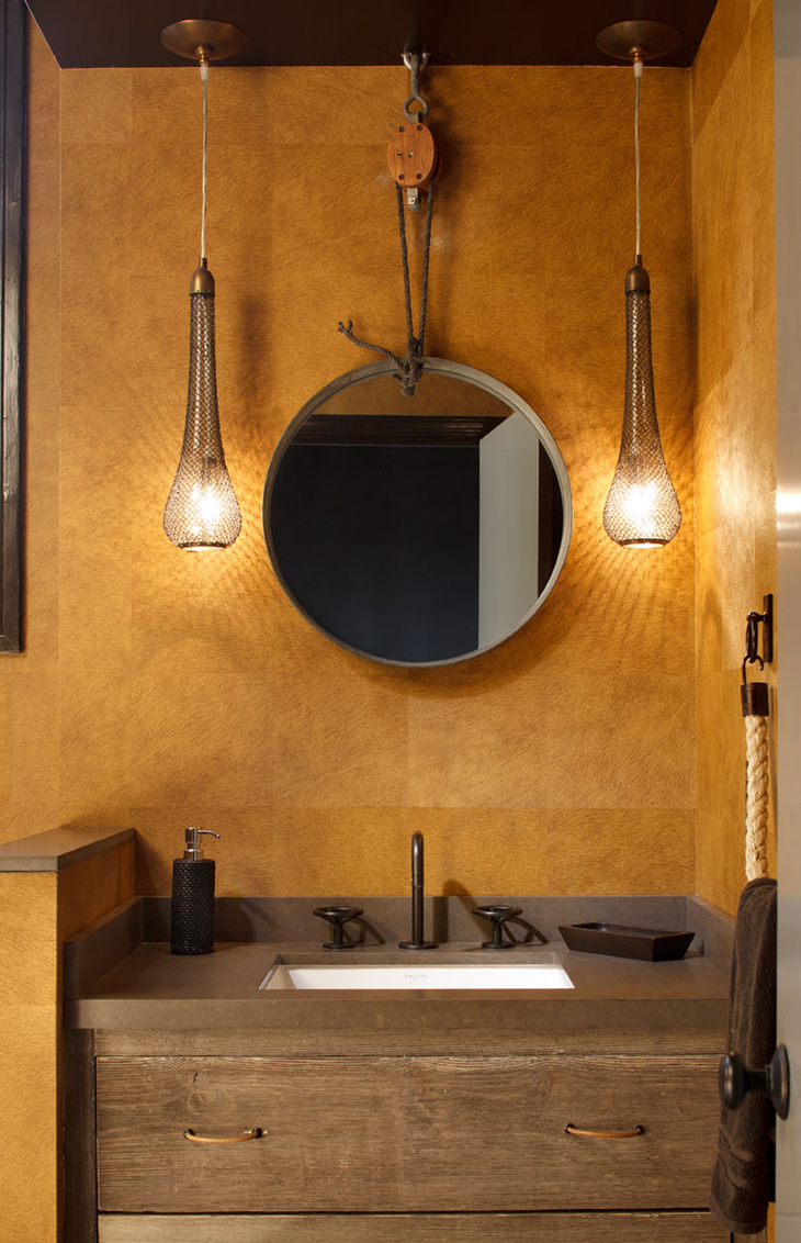 Del baño 9 me encantan las pequeñas y sutiles lámparas que cuelgan a los lados del espejo y el maravilloso y rotundo mueble de madera sin barnizar.
