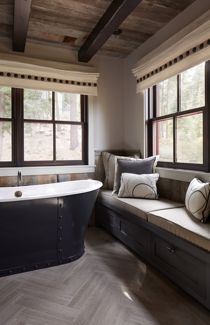 Este baño (1) tiene un estilo de cabaña rústica pero sin perder un ápice la confortabilidad de un baño actual. Elementos como el techo, los espejos colgados de forma original y el zócalo de madera recuperada le dan ese aspecto rústico. Pero yo hubiera cambiado el suelo de este baño (no se porqué, pero no me acaba de convencer) por el suelo de la habitación que se adivina al lado. Me parece que ese suelo es más acorde en tono y textura y además, le habría dado continuidad al baño con la habitación.