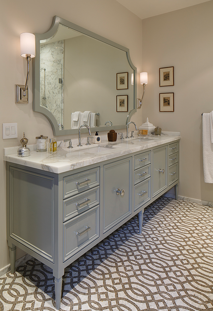 De este baño clásico (4) me quedo con ese osado y marcado suelo en mosaico geométrico. Irrepetible.