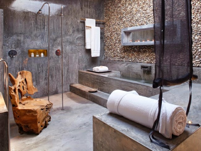Es una cuestión de mezcla de texturas, de espacios amplios sin recargar, con una base fría de piedra o cemento pulido que aporta pureza de lineas, con el toque orgánico de la madera en pinceladas muy pequeñas, lo justo para dar ese aire rústico y acogedor.