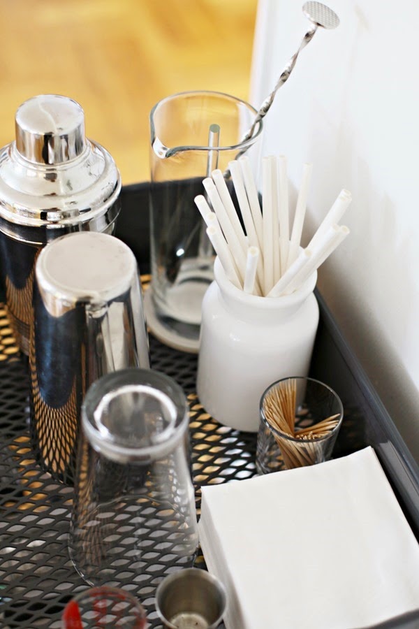 Una vez reunidos todos los elementos necesarios, sólo nos queda ordenarlos. Según vuestros gustos podéis darle un toque más clásico o más desenfadado, pero, para que no os falte la inspiración, yo os propongo dos ejemplos, uno pensado para un chico aficionado a la coctelería que acaba de realizar un curso y quiere ponerlo en práctica, y otro para una chica no tan aficionada a los cócteles como a la decoración ;)