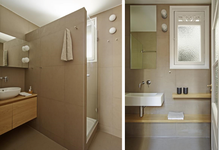 Las instalaciones de aire acondicionado se ocultan mediante una vigueta en el falso techo, que además soporta el techo del salón. Donde no existían pavimentos originales de valor, se instalan porcelánicos de 60 x 60 en un cálido gris.