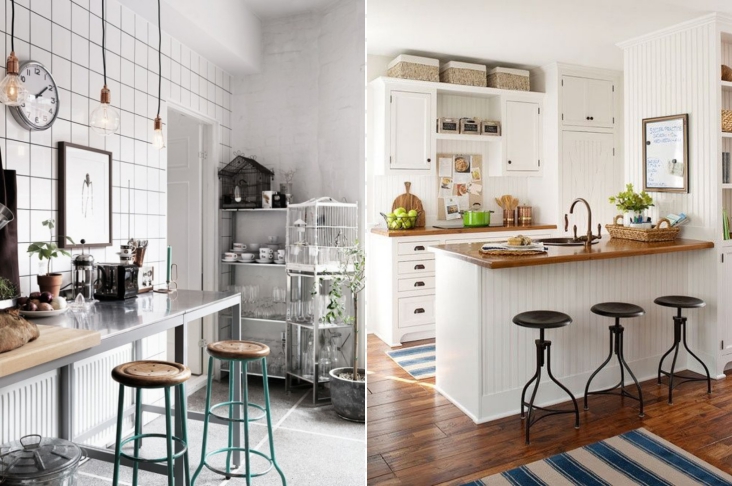 Si simplemente tenéis un espacio de un metro o poco más de pared disponible, ya sería suficiente para hacer una barra de desayuno para dos personas. Lo único que necesitaréis será una balda de madera de la medida que mejor se ajuste al espacio (se puede pedir a medida en cualquier tienda de bricolaje), dos taburetes y dos soportes. Podéis cambiar el color de la madera con un barniz y hacerlo vosotros mismos en casa.